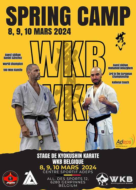 March 8-10, 2024 in Gerpinnes will be held the WKB Belgium spring camp. instructors: Shihan Daniel Sanchez and Shihan Mohamed Belazghem. Spring Camp WKB 2024 EN Spring Camp WKB 2024 instription Spring Camp WKB 2024 FR